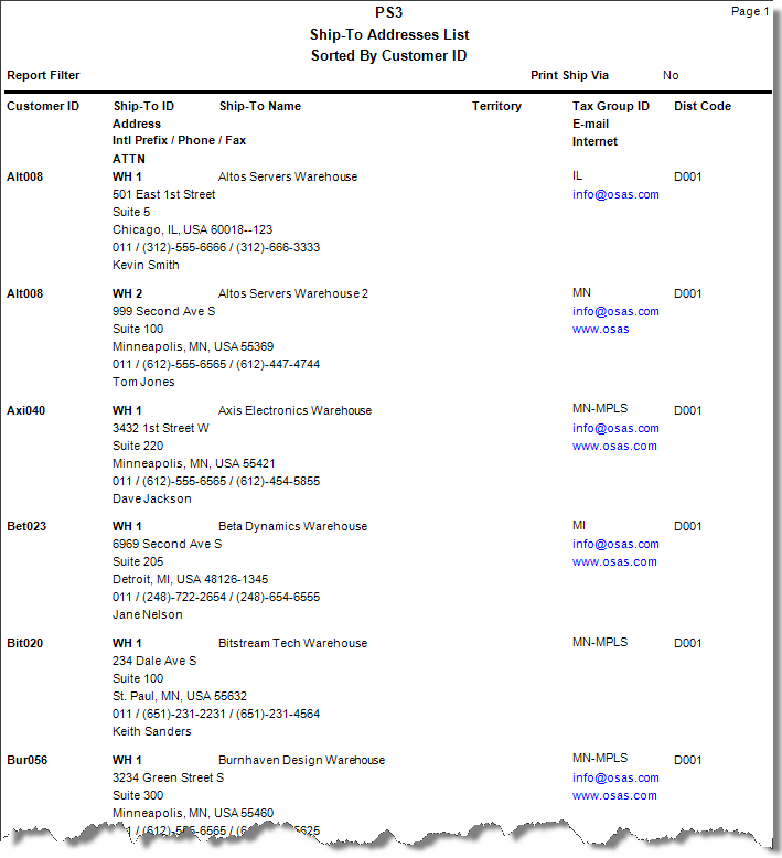 Use the Ship-To Addresses List function to produce a list of the ship-to addresses. To change ship-to address information, use the Ship-To Addresses function.
