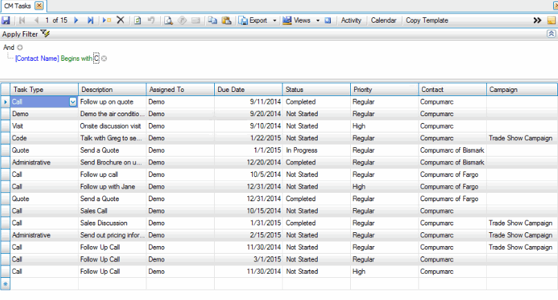 While activities record what has been done for a contact, tasks record the things that you or your employees need to do to in order to further communication with a contact. Instead of being associated with a contact, tasks are associated with your employees, the users of CRM. Tasks are assigned to employees for completion and can carry expiration or due dates.