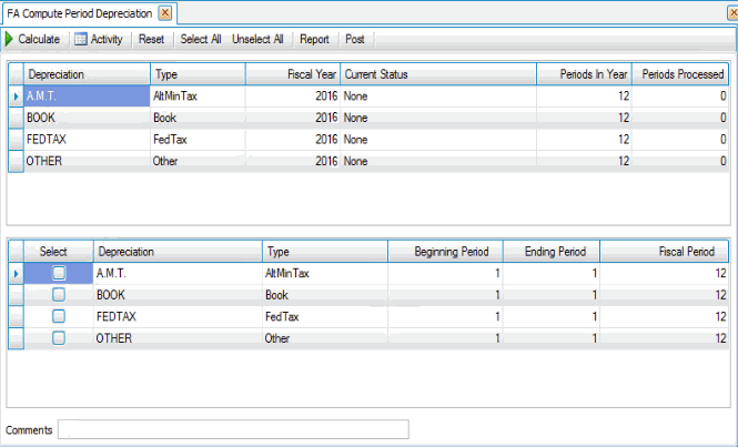 The bottom section is used to select which Depreciation Types to calculate, the Beginning and Ending Periods for calculation and your current Fiscal Period.
