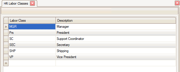 Use the Labor Classes function to set up and maintain labor classes, which allow you to group types of employees together. For example, MLM could be assigned to all mid-level managers, CLK could be assigned to all clerical employees, and so on. You can classify employees according to their primary job responsibilities. Examples of labor classes could include ASM for assembly personnel, ADM for administrative personnel, or SPV for supervisors.
