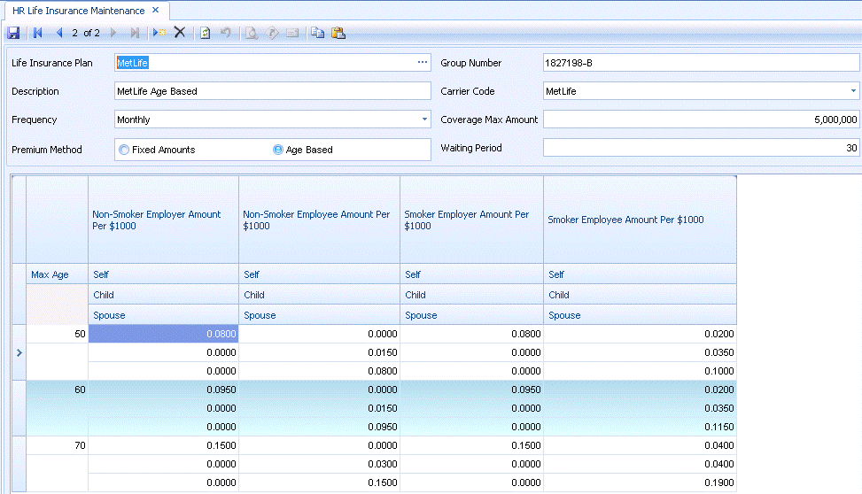 ) at the bottom of the screen to add data.- Only for Age Based Premium Method: Enter the maximum age for which this group of premiums pertains in the Self -- Max Age field.