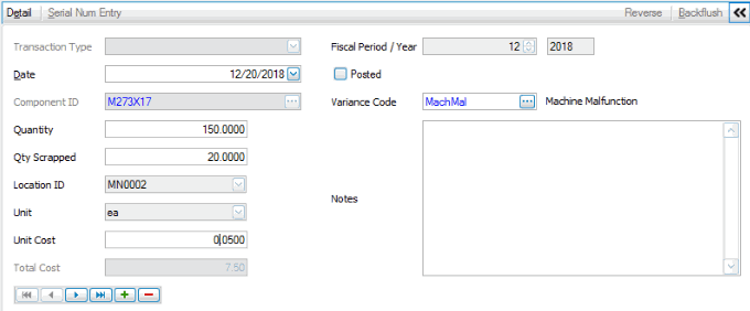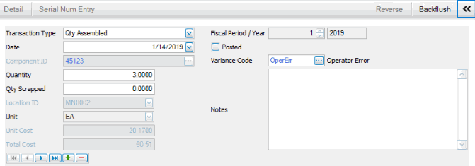 Be aware that the backflush process does not generate entries for lotted or serialized items. Those items must be entered manually in order to assign lot and/or serial numbers.
