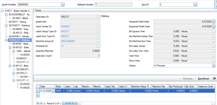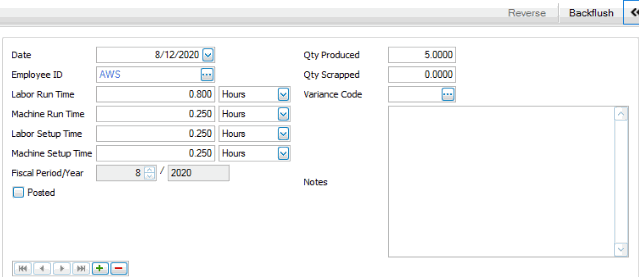 Note: If you select Completed, you can not make any additional changes to the time's production activity. - Click the Save button, on the toolbar, to save the recorded production activity.