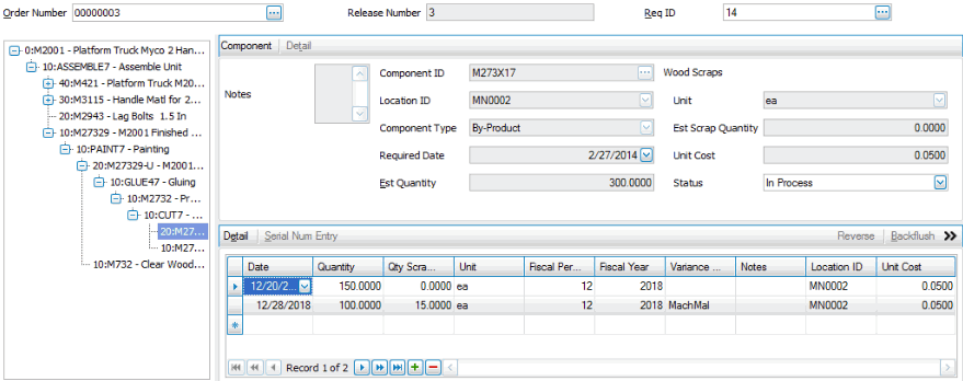 Note: If you select Completed, you can not make any additional changes to the component's production activity. - Click the Save button, on the toolbar, to save the recorded production activity.