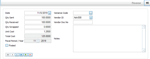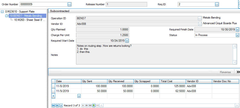Record subcontracted component activity that generally takes place offsite and for which the costs are fixed or are beyond your control. Enter the quantity sent, as inventory is sent out, and enter the quantity returned, when inventory returns.