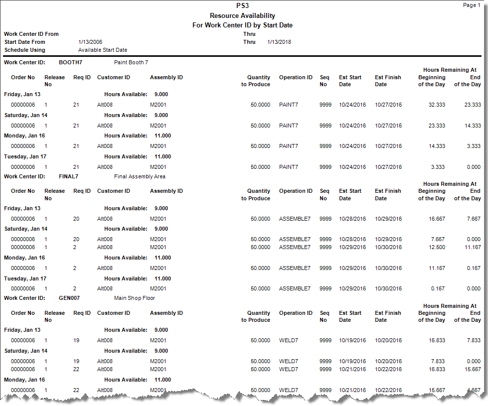 The Resource Availability report is a capacity-oriented report that can be run for work centers, machine groups, or labor types. The report order is defined using the Dispatch Production function, or if you did not use the Dispatch Production function, the report is arranged by the required start date for each order. The final sort criteria is the production order number. Orders with the same start date, which do not have a sequence defined using the Dispatch Production function, appear in production order number sequence.