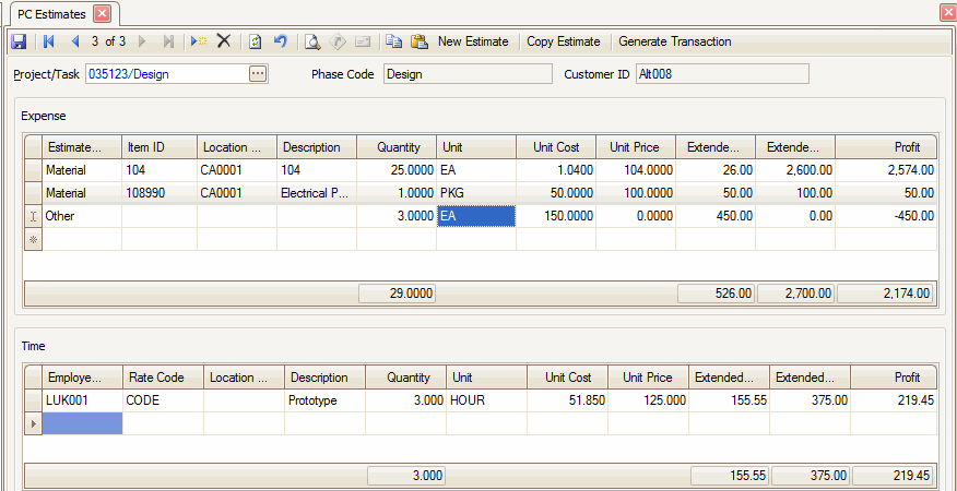 - Use the New Estimate button on the toolbar to add another estimate record to the project/task.