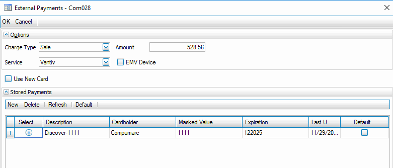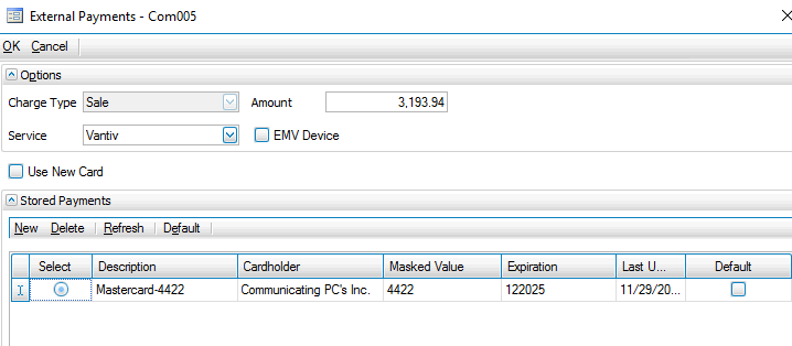 - When you click OK, the External Payment entry form for the customer will display. The stored external payment information will appear in the Stored Payments detail section of the screen. If there is no external payment method on file, click the New button to open a credit card information entry form.