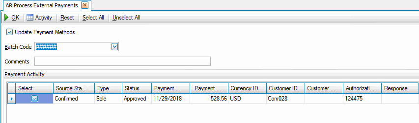 - Mark the Select check box for the payment records you want to process. Use the Select All button on the toolbar to mark all the check boxes, or use the Unselect All button to clear all the check boxes.