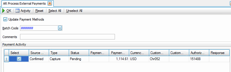 - Use the Process External Payments function on the AR Transaction Journals menu to generate the cash receipt for the payment.