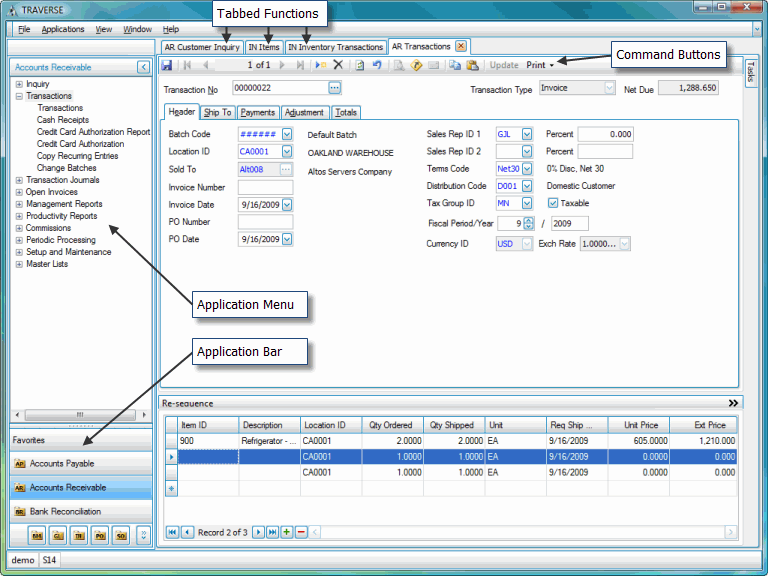 Traverse applications are listed in the lower left side of the screen, with the selected application and its functions appearing in the Application Menu. With the tabbed function feature, you can open multiple functions at once and keep them neatly organized. You can perform all of your tasks using the keyboard only or using the mouse and the keyboard.