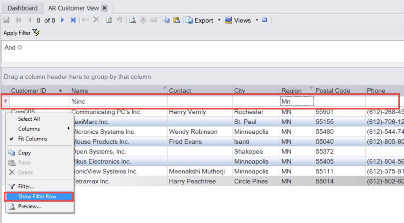 In the example below, we used the % wildcard in the name field to find any company names that include “inc” and entered Mn in the Region column to limit the list to Minnesota companies.