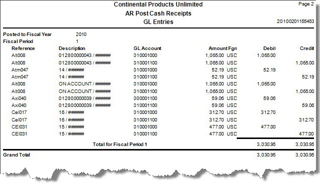 If Accounts Receivable interfaces with General Ledger, debit and credit entries are created in the GL Journal. If detail information is posted, entries are made for each cash receipt entry. If summary information is posted, one entry is made for each account. If the accounting period is closed, you can either edit cash receipts or use the System Manager Period Conversion function to open the accounting period and then post the cash receipts.