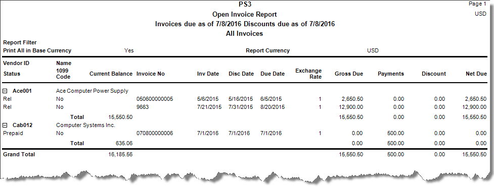 NOTE: Invoices for vendors that are on hold are included in the Open Invoice Report, but payments are not prepared for those vendors.