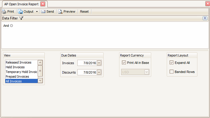 - Select whether to expand all of the vendor's open invoice list using the Expand All check box. If you do not mark Expand All, you will have a plus (+) sign next to the vendor, when you preview the report. When you click on the plus (+) you will see all the invoices for that vendor that meet the selection criteria.