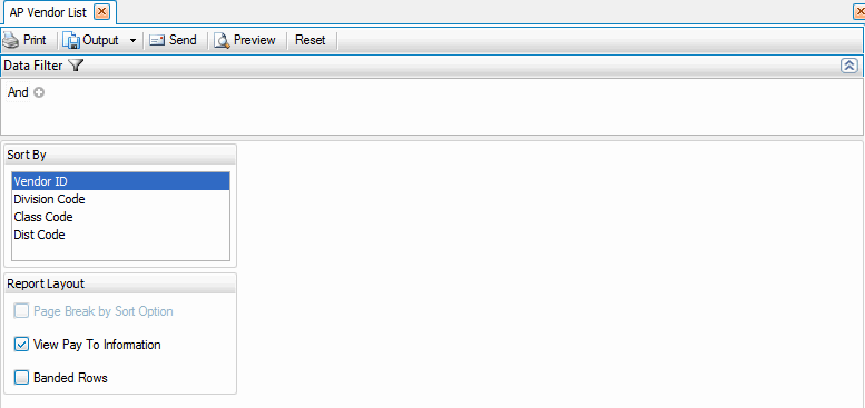Use the Vendor List function to produce a list of the information stored in your vendor records, vendor’s name and address, pay-to name and address, purchasing information, and 1099 information.