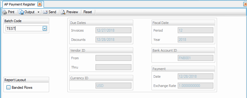- The Invoices Due Date, Vendor IDs, Currency ID, Discounts Due Date, Payment Date, Fiscal Period and Year, Bank Account, and Payment Exchange Rate you selected when you prepared payments are displayed.