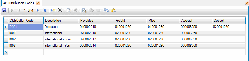Use the Distribution Codes function to set up and maintain distribution codes, which allocate general ledger accounts for payables, freight, and miscellaneous charges. Distribution codes are tied to specific vendor records.
