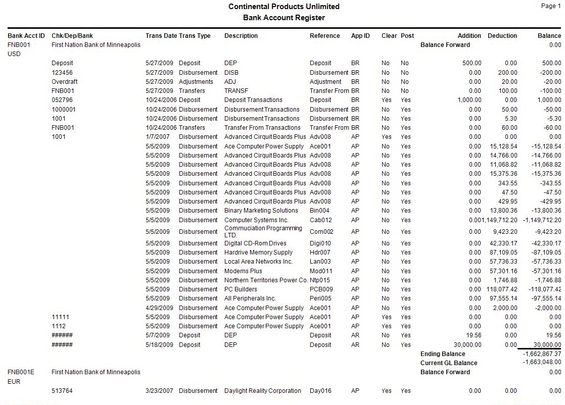 The Bank Account Register is similar to a check register. The register is organized by bank account ID and then by transaction date. It includes the beginning balance, the effect of each posted and unposted transaction, and the ending balance.