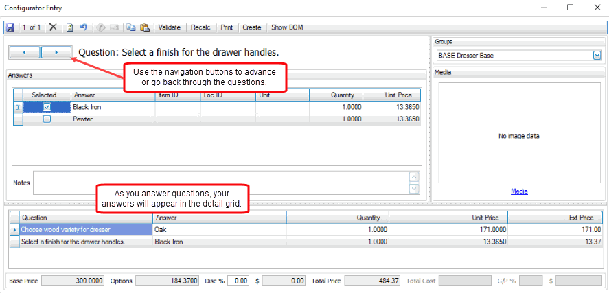 To keep things simpler for this example, we will use inventory pricing where available for inventory items. The prices of the configured items are added together for the final price