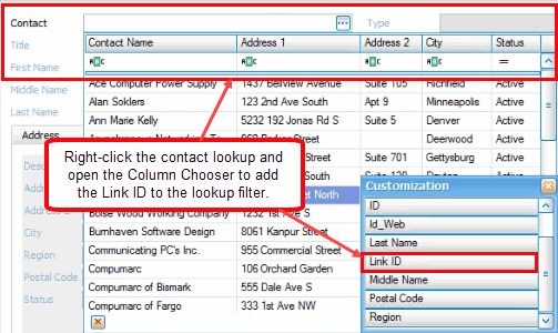 You can add the Link ID to any contact lookup filter to improve reporting and search for contacts tied to other entities within the system (customer, vendor, and employee). You can add the Link ID and the Link Type to task, activity, and opportunity lookup filters to improve reporting and searching.