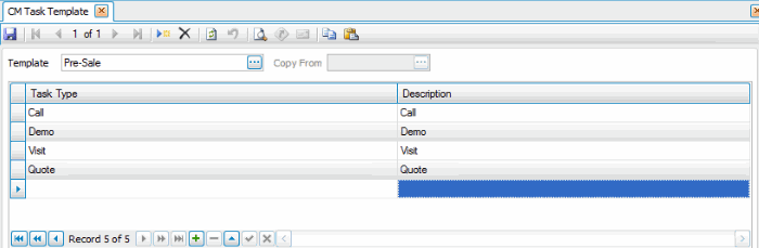You can now create a Task Template, where you can include individual tasks that are performed as part of your process. This simplifies the addition of those required tasks to a contact and eliminates the possibility of a missed step in the process. A Task Template maintenance screen is available on the CRM Setup and Maintenance menu. See the Task Template topic for details.
