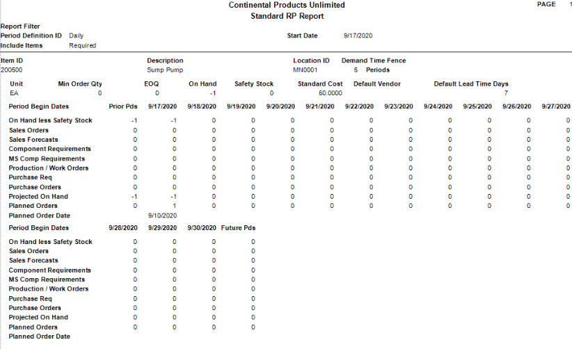 Use the Standard RP Report function to view which items need to be purchased and what assemblies need to be built within a specific time frame. The Standard RP report has two main purposes: to provide you with information you can use to plan item purchases or to plan new work orders for assembled items.
