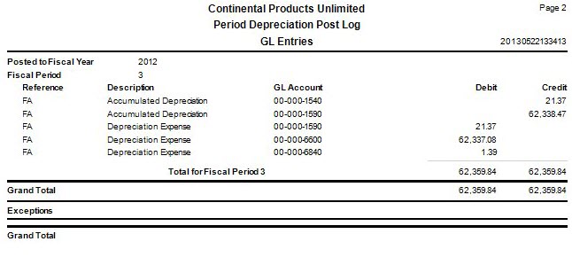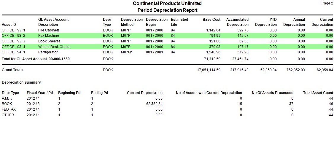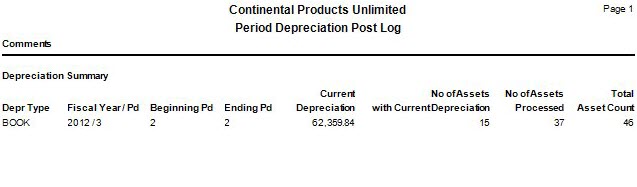 The Period Depreciation Report produces a journal of accumulated depreciation taken and the year-to-date, annual, and current depreciation for active assets. You can use the journal to verify the depreciation figures before you post depreciation.