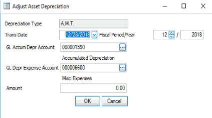 If you are adding a new asset, leave this field blank. If you are adding a record for an existing asset, click the Adjust button on the menu bar to display the Adjustment screen. Enter or accept the defaults for Trans Date, Fiscal Period/Year, GL Accum Depr Account, and GL Depr Expense Account fields. Enter the amount of the adjustment amount into the Amount field and click OK. The YTD Depreciation Taken field will be updated with this amount. Click Recalculate button on the menu bar to calculate the Scheduled Annual Depreciation and Remaining Depreciation Base amounts.