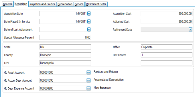 Use the Acquisition tab to enter purchase information, the location of the asset, and the default General Ledger accounts. The information entered on this tab is used for report generation and depreciation calculations.