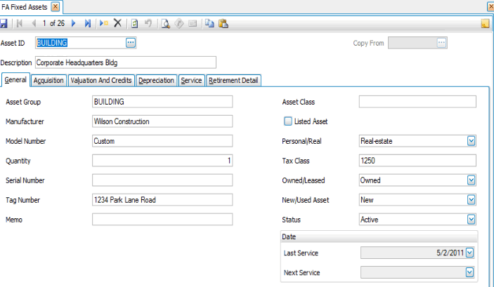 Use the Fixed Assets function to set up and maintain records for each asset. A record contains general information, as well as information on acquisition, valuation and credit, depreciation, service, and retirement.