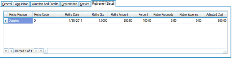 The Retirement Detail tab is for information only. Use the Retire Assets function to edit retirement information. If the asset's status is anything other than Retired, no information appears.
