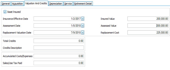 - Enter the amount the asset is insured for in the Insured Value field, the assessed value of the asset into the Assessed Value field, and the cost to replace the asset into the Replacement Cost field.