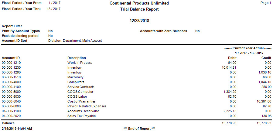 Use the Trial Balance Report to verify individual account balances or to make sure that an out-of-balance condition is corrected. You can produce actual, budget, last-year, or forecast balances. The budget and forecast balances will come from the budgets and forecasts you set up in the account budgets and forecasts function.