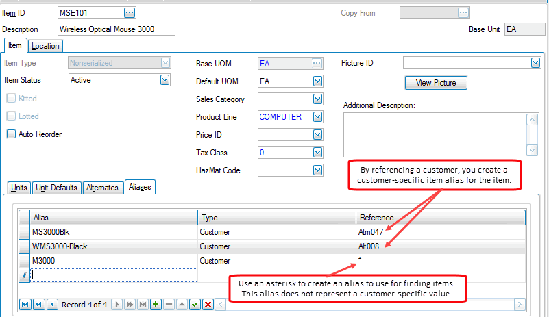 • When entering a customer item alias into the inventory item file, be aware that the most recent alias will be the one referenced in any sales orders, AR transactions, etc. If you have multiple customer part numbers (customer item aliases) for a single inventory item, the first alias ID alphabetically will be used.