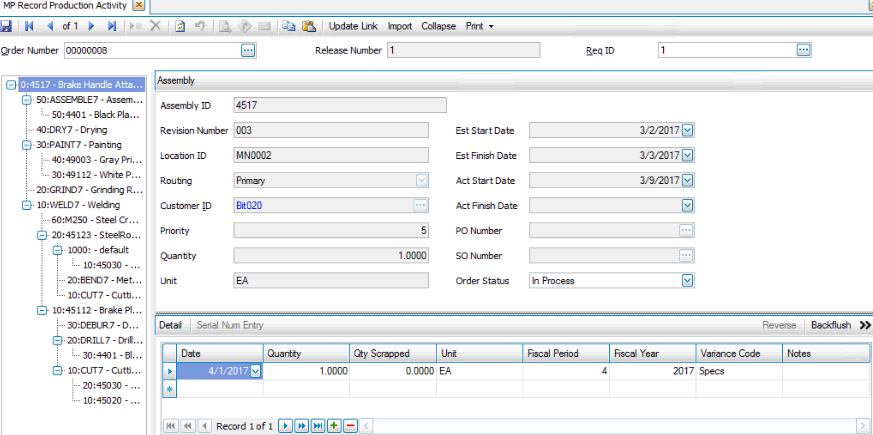 Note: If you select Completed, you can not make any additional changes to the component's production activity. - Click the Save button, on the toolbar, to save the recorded production activity.
