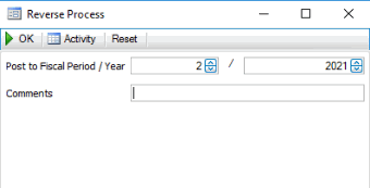 Click To OK Run the reversal process. Activity Display the Activity Log to view posting activity. Reset Set all fields to their default values. - A notification will appear when the reversal process is complete.