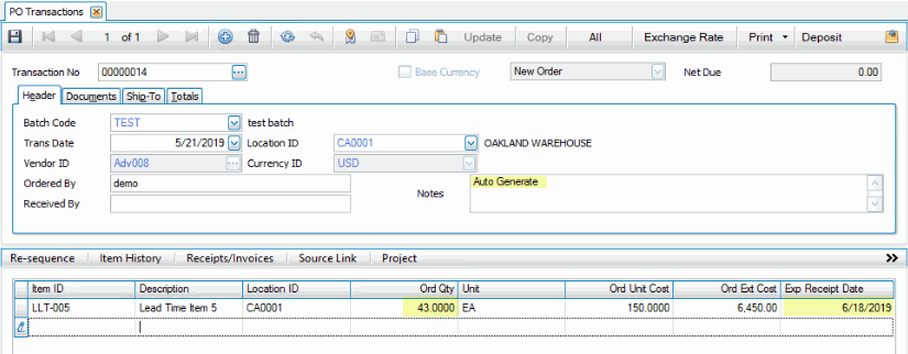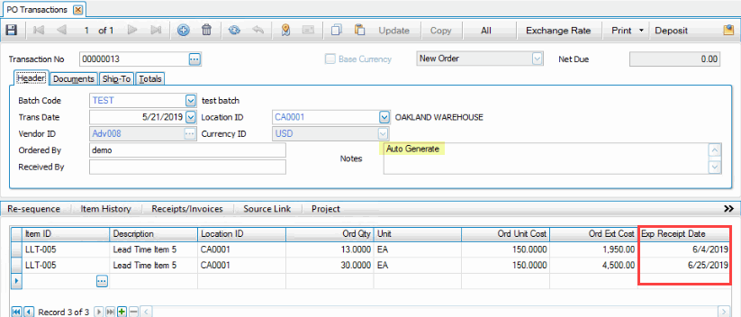 An Expected Receipt Date field has been added to the Ship-To tab on the PO Transactions screen, as well as in the line items grid at the bottom of the screen. Use this field, in either location, to indicate to the system when you want to receive the item in-house and have it available for use. The Requirements Planning process will use this date when calculating availability and purchase requisition dates.