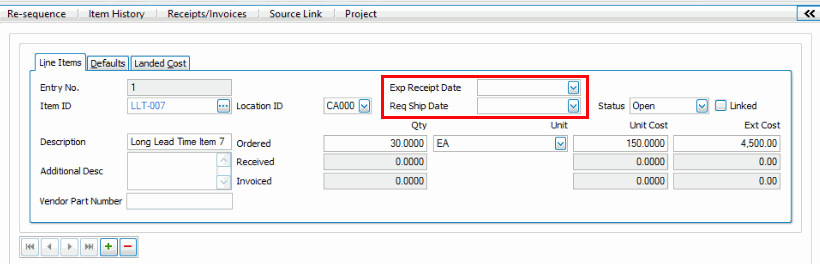 The Expected Receipt Date is the date you want the product received in-house and available for use in production or to ship to a customer. This can help your vendor plan when to ship the items so they arrive at your facility when they are needed.