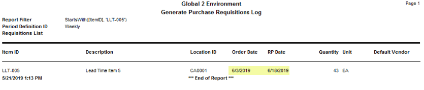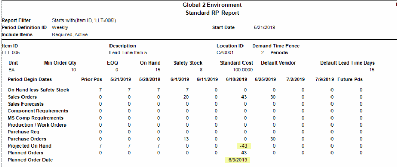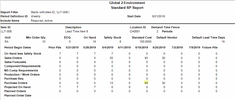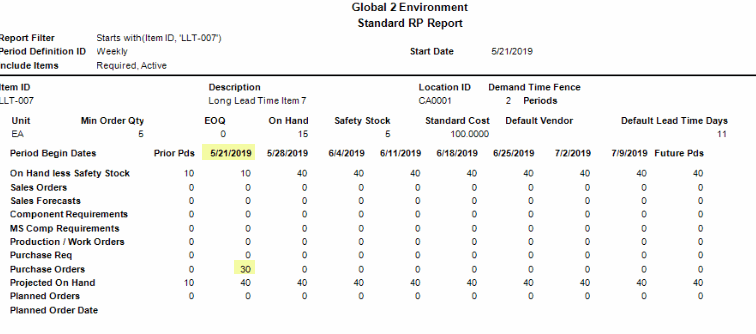 Now the RP report shows the items will be available by the PO Transaction Date. Note that even though the RP Report shows the items are available on 5/21/2019, it is not the actual date the items would be available in-house, because even if the vendor shipped the product on that day, it might take a week for those items to arrive. Using the PO Transaction Date as a basis for requirements planning calculations can be quite inaccurate.