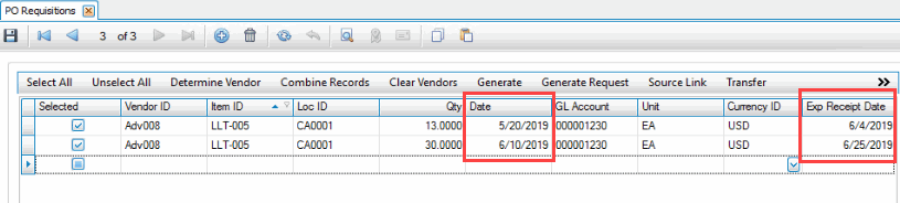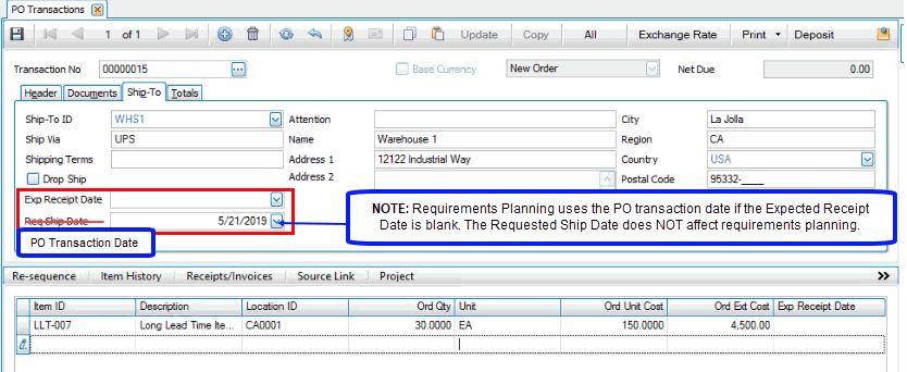 When creating purchase orders, you can ensure the items on the order are calculated properly by requirements planning by utilizing the Expected Receipt Date field. The Expected Receipt Date is the date you want to receive the order in-house. There is an expected receipt date field in the PO Transaction header on the Ship-To tab, as well as on each line item. The system will use the line item expected receipt date first, then the expected receipt date in the header if the value does not exist on the line item. If neither value exists, the system will use the PO transaction date to use for requirements planning. (Keep in mind that the PO Requested Ship Date is the date you are asking your vendor to ship the item, and not the date you want the item to arrive. The PO Requested Ship Date does not affect requirements planning.)