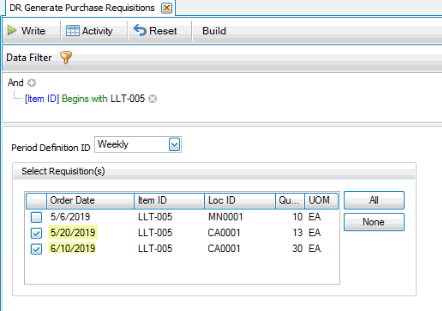 Select the requisitions that match the shortages for the inventory location listed on the sales orders. Click Write to create the requisitions.