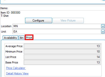 The Price tab shows the average, minimum, list, and base prices, as well as links to the Price Calculator and the Detail History View.