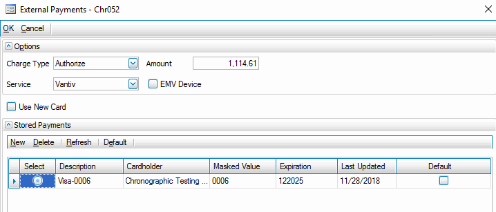- When you click OK, the External Payment entry form for the customer will display. The stored external payment information will appear in the Stored Payments detail section of the screen. If there is no external payment method on file, click the New button to open a credit card information entry form.