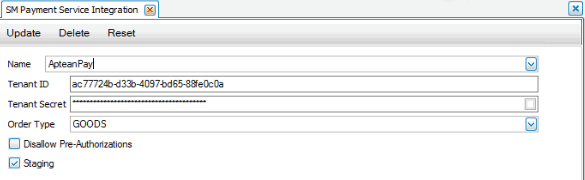 - Use the Update button on the toolbar to update the payment service settings with the values you entered/edited.