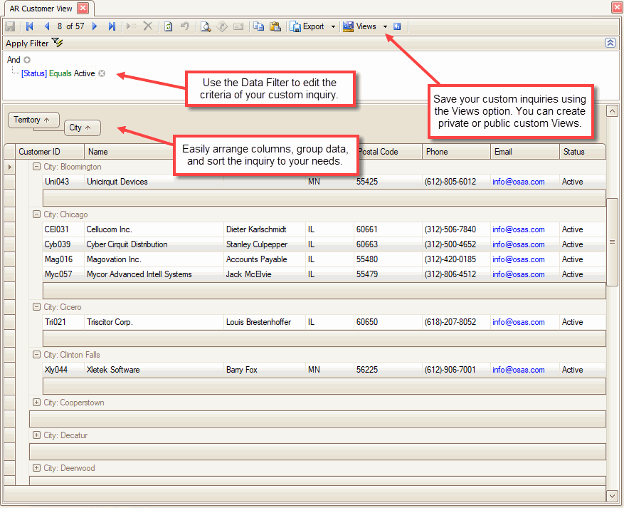The Traverse interactive view functions display information in an interactive format; these are highly configurable data screens that allow you to sort, group, and output the view according to your unique needs. Most views also include a totals bar, making it easier to add analysis values to the data.