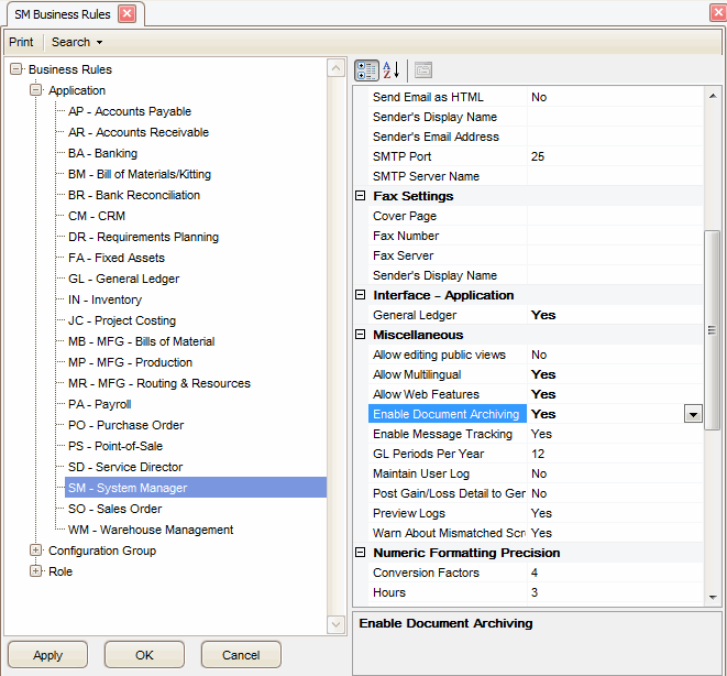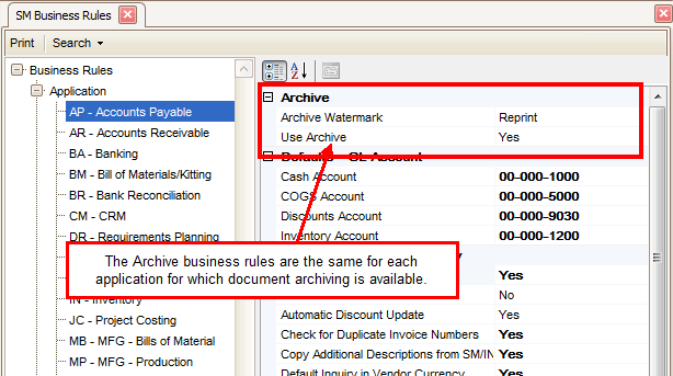 In order to utilize the Document Archiving functionality, you must set the System Manager Business Rule to Enable Document Archiving to Yes. If you set the rule to No, the Archive settings in the application's business rules will have no effect.