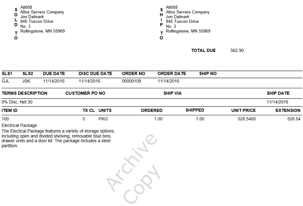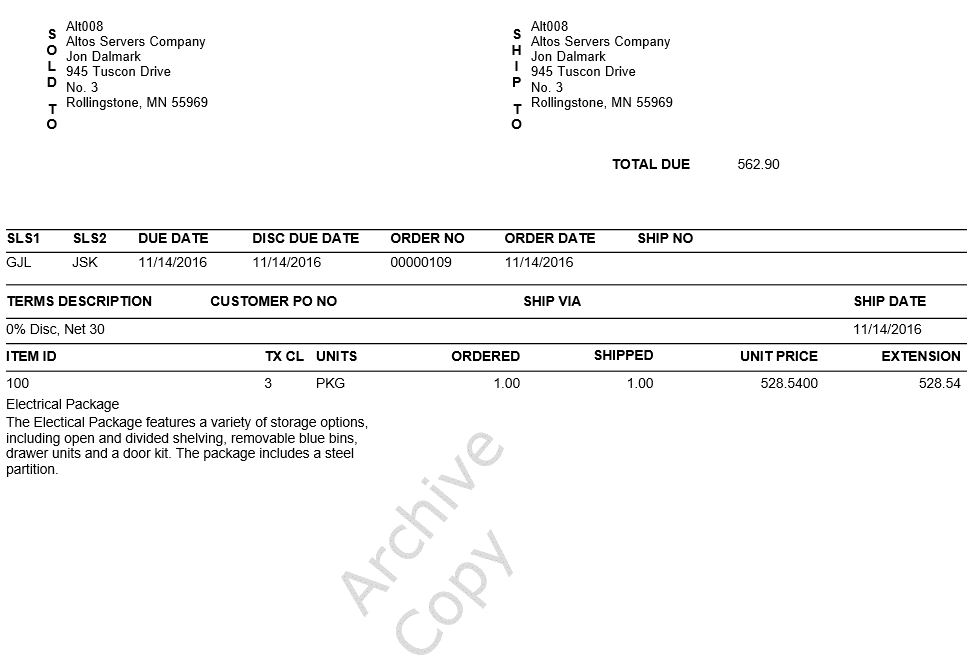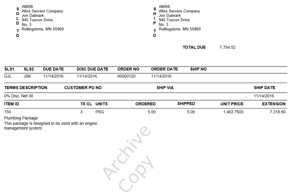 In other words, if Use Archive is set to No, after users print an invoice, order, or check stub, they will not have the capability to reprint prior printed versions of documents, and the Search Document feature will be unavailable. There are still functions that allow users to reprint a document using data from the history files.
