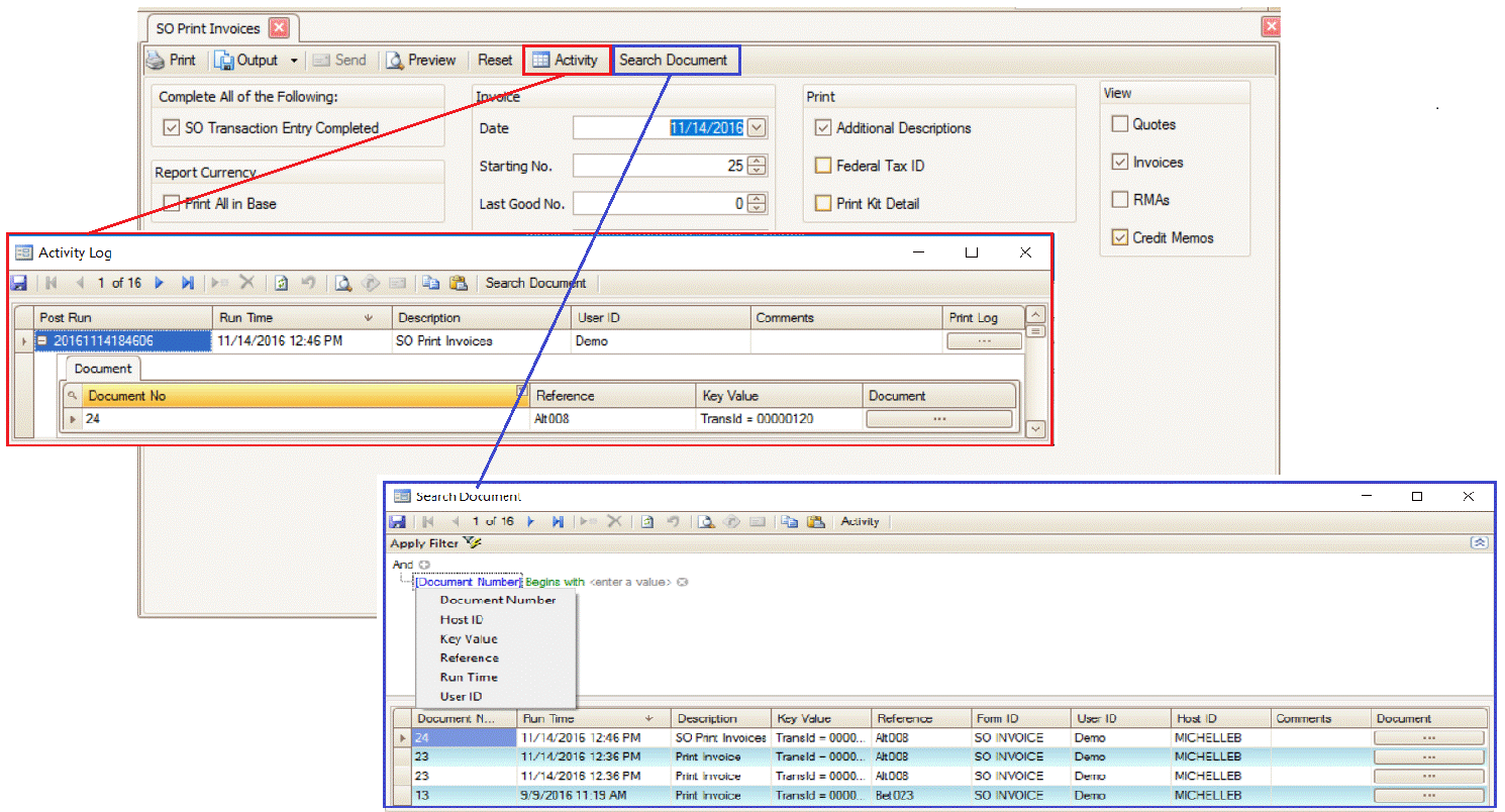 When printing documents from history, you have the option to retrieve archived copies instead of re-rendering from data in history tables. Transactions entered starting in build 16316 will include archived copies, but when they do not exist for transactions entered before this build, documents will be re-rendered using history data.