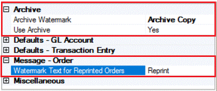 If the document was printed online or using batching with the new document archiving feature enabled, the Business Rule Archive Watermark text will print. If the document was printed before build 16316, or if the Use Archive option is set to No, the Watermark Text for Reprinted Orders/Invoices will print.